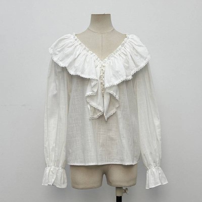 French Ruffle V-neck Long Sleeve Shirt Gentle Style Loose White Top
