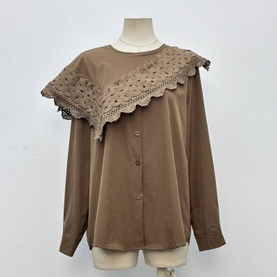 Vintage Crochet Shawl Style Long Sleeve Shirt Loose Casual Solid Color Top