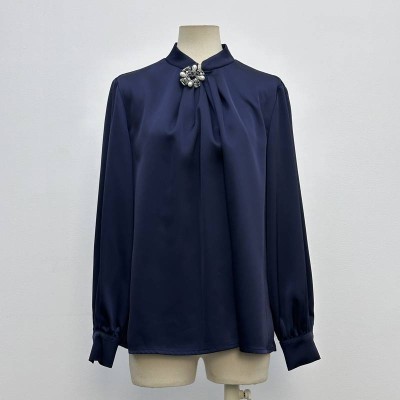 Navy Satin Stand Collar Diamond-Embellished Long Sleeve Blouse