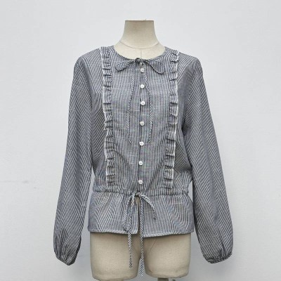French Striped Lace-up Long-sleeve Shirt Waist-cinching Slim Round Neck Ruffled Top