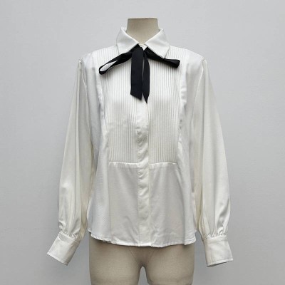 Elegant Bow Tie White Shirt Vintage Pleated Long Sleeve Satin Blouse