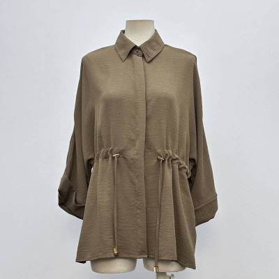 Khaki Lapel Drawstring Waist Shirt Loose Batwing Sleeve Mid-length Top