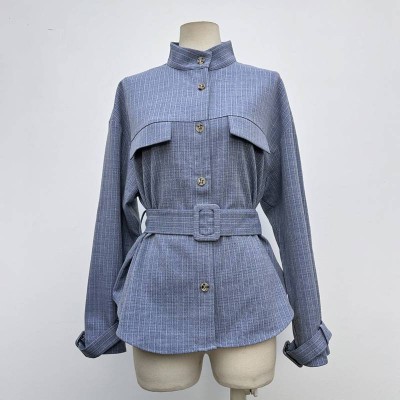 Stand Collar Waist-Tie Striped Shirt Vintage Commuter Long Sleeve Top