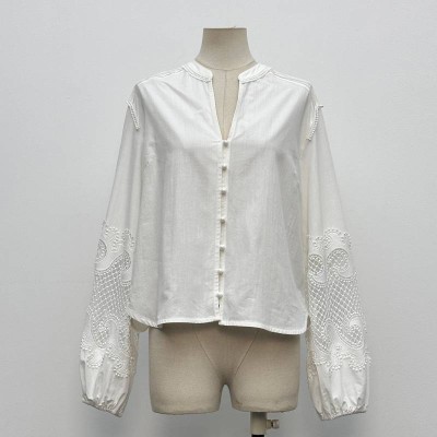 White Embroidered V-neck Long Sleeve Shirt Loose Casual Cotton Blouse