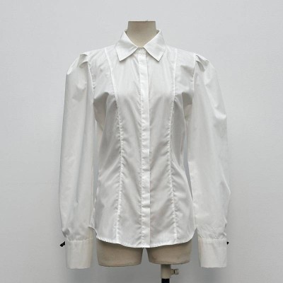 Elegant Waist-cinched Puff Sleeve White Shirt Commute Long-sleeved Turn-down Collar Blouse