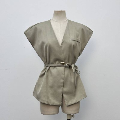 Elegant V-neck Waist-cinched Sleeveless Top Commuter Style Lace-up Slim Fit Blazer-style Top